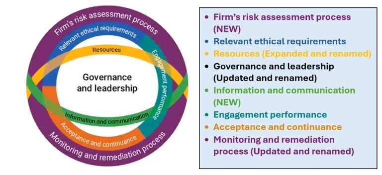 The items listed and in the image, below, are components of the new SQMS, initially introduced when the International Auditing and Assurance Standards Board rolled out their quality management standards. Three components are elements of the extant quality control standards (“QCS”); three are renamed and expanded/updated elements of the (soon to be replaced) QCS; and the new components are the two COSO components not addressed in the extant QCS.